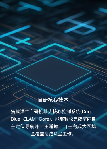 搭載深蘭自研機(jī)器人核心控制系統(tǒng)(DeepBlue SLAM Core),能夠輕松完成室內(nèi)自主定位導(dǎo)航并自主避障,自主完成大區(qū)域全覆蓋清潔除塵工作。