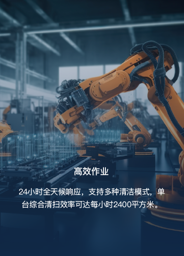 24小時(shí)全天候響應(yīng),支持多種清潔模式,單臺綜合清掃效率可達(dá)每小時(shí)2400平方米。