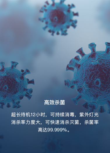 超長待機12小時,可持續(xù)消毒,紫外燈光消殺率力度大,可快速消殺滅菌,殺菌率高達(dá)99.999%。