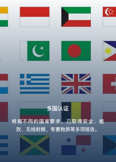 根據(jù)不同的國(guó)家要求,已取得安全、能效、無(wú)線射頻、有害物質(zhì)等多項(xiàng)報(bào)告。