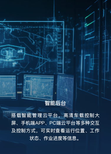 搭載智能管理云平臺,高清車載控制大屏、手機端APP、PC端云平臺等多種交互及控制方式,可實時查看運行位置、工作狀態(tài)、作業(yè)進度等信息。