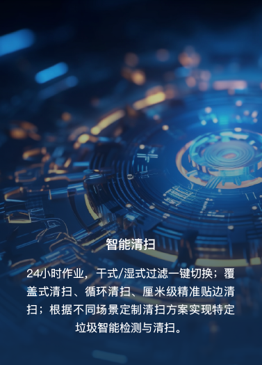 24小時作業(yè),干式/濕式過濾一鍵切換;覆蓋式清掃、循環(huán)清掃、厘米級精準(zhǔn)貼邊清掃;根據(jù)不同場景定制清掃方案實現(xiàn)特定垃圾智能檢測與清掃。